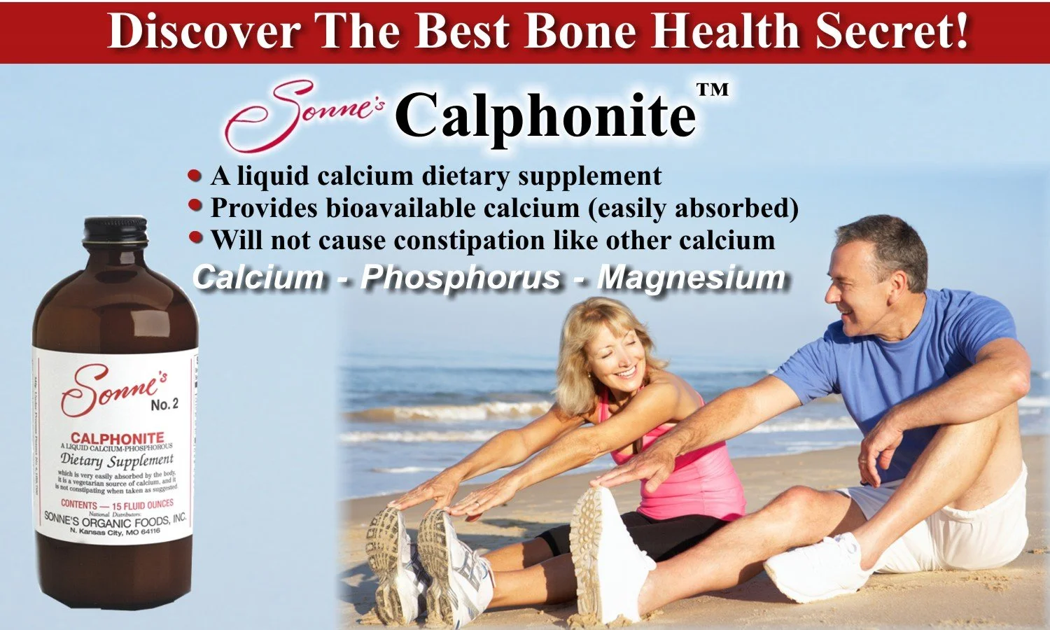 Sonne's Calphonite™ #2, our liquid calcium supplement, contains demineralized water, Bentonite, dicalcium phosphate, magnesium, and manganese. Through a special process, the dicalcium phosphate is broken down, and the calcium is bound in the ionic state to phosphated Bentonite. Compared to regular dicalcium phosphate, the calcium in Calphonite™ has a much greater assimilation rate. The result is a calcium supplement that is very easily and quickly assimilated by the body (within 90 minutes).